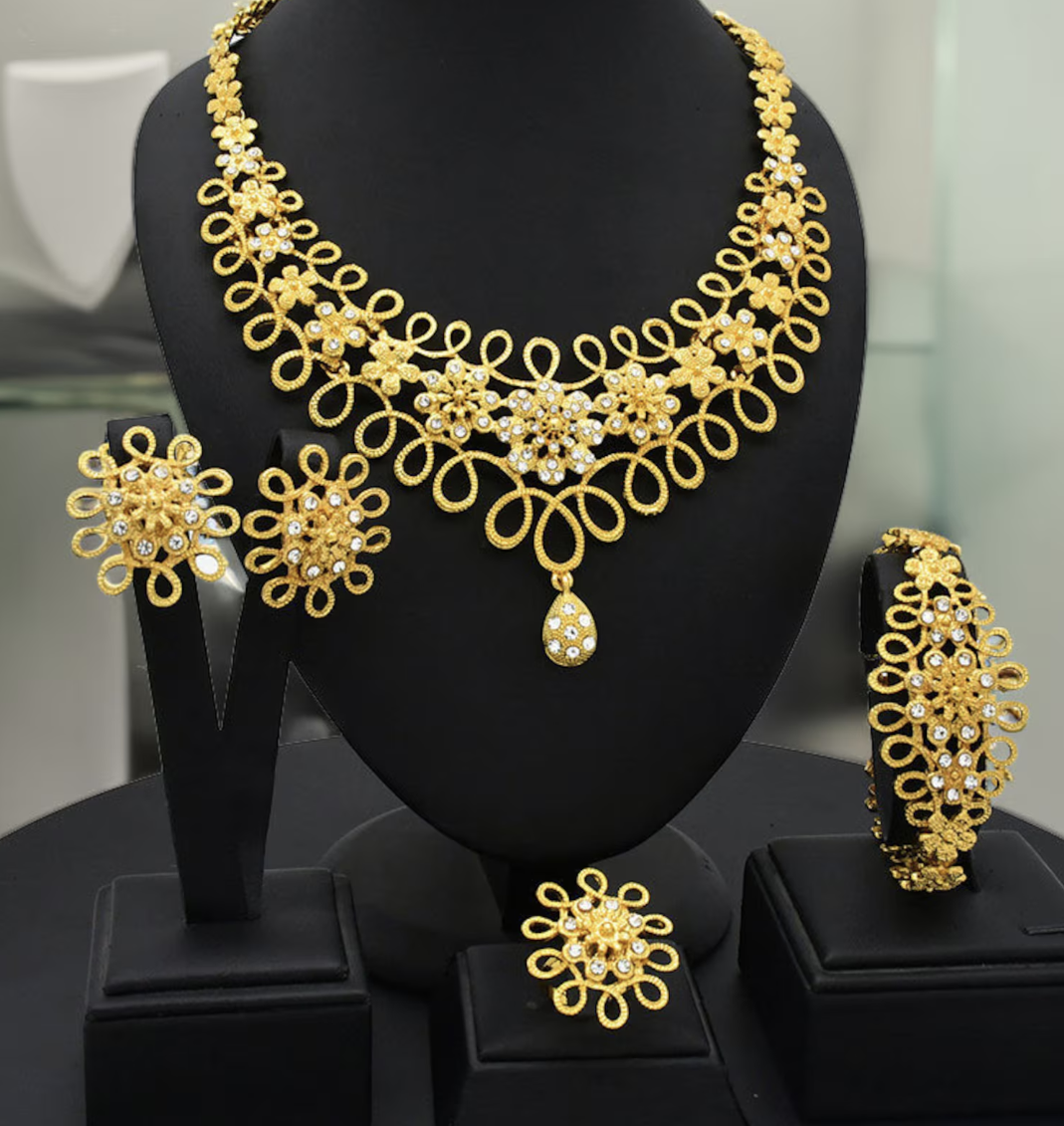 • Composants : Collier imposant, boucles d’oreilles pendantes, bracelet assorti, bague élégante
