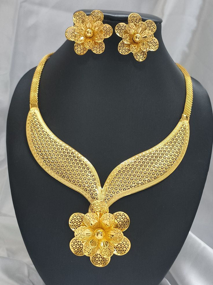 Cette parure somptueuse rend hommage à l’artisanat d’exception des bijoutiers Akan. Composée d’un collier rigide au design floral délicatement ciselé, accompagné de deux boucles d’oreilles assorties en forme de fleurs pleines, elle incarne le mariage parfait entre tradition africaine et raffinement contemporain.